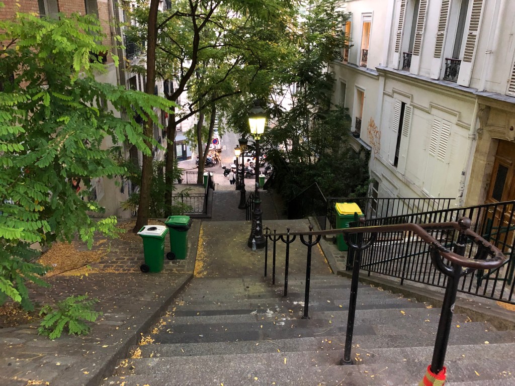 Vi fortsætter af Rue Ravignan og over den lille, fine plads Place Emile-Goudeau. For enden drejer vi til højre af Rue Berthe, og så tager vi trappegaden Rue Drevet.